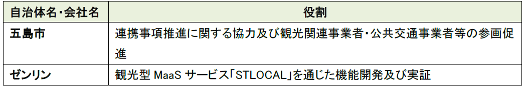 令和4年度に五島市が取り組みました「五島版観光型MaaS開発事業」の一環として、令和5年2月から五島列島における観光型MaaS「STLOCAL」の導入及び利活用を開始しました。本サービスの継続的な運営、及び利便性向上の実現のため、下記項目に関する連携・協力を行います。