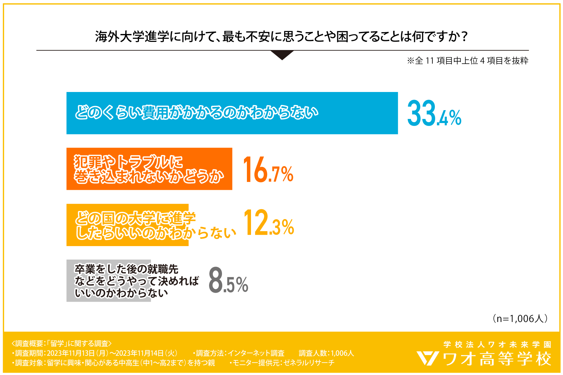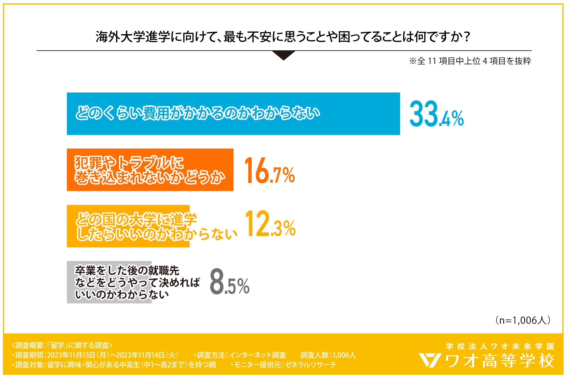 「海外大学進学に向けて、最も不安に思うことや困っていることは何か?」と質問したところ、『どのくらい費用がかかるのかわからない(33.4%)』と回答した方が最も多く、次いで『犯罪やトラブルに巻き込まれないかどうか(16.7%)』『どの国の大学に進学したらいいのかわからない(12.3%)』と続きました。