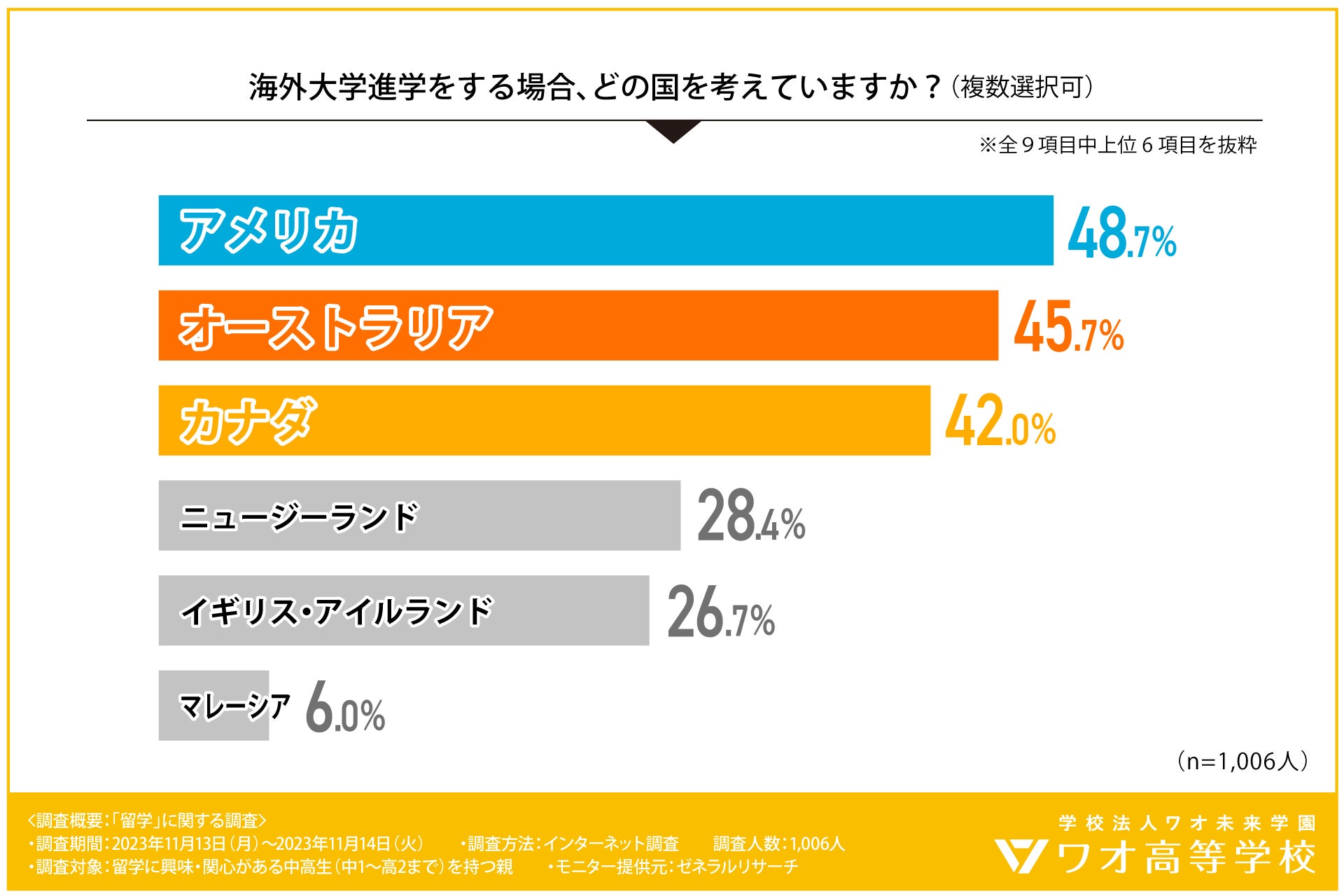 「海外大学進学をする場合、どの国を考えていますか?(複数選択可)」と質問したところ、『アメリカ(48.7%)』と回答した方が最も多く、次いで『オーストラリア(45.7%)』『カナダ(42.0%)』と続き、英語圏の大学進学がTOP3に入りますが、最近人気が出てきたマレーシアも一定数の回答がありました。