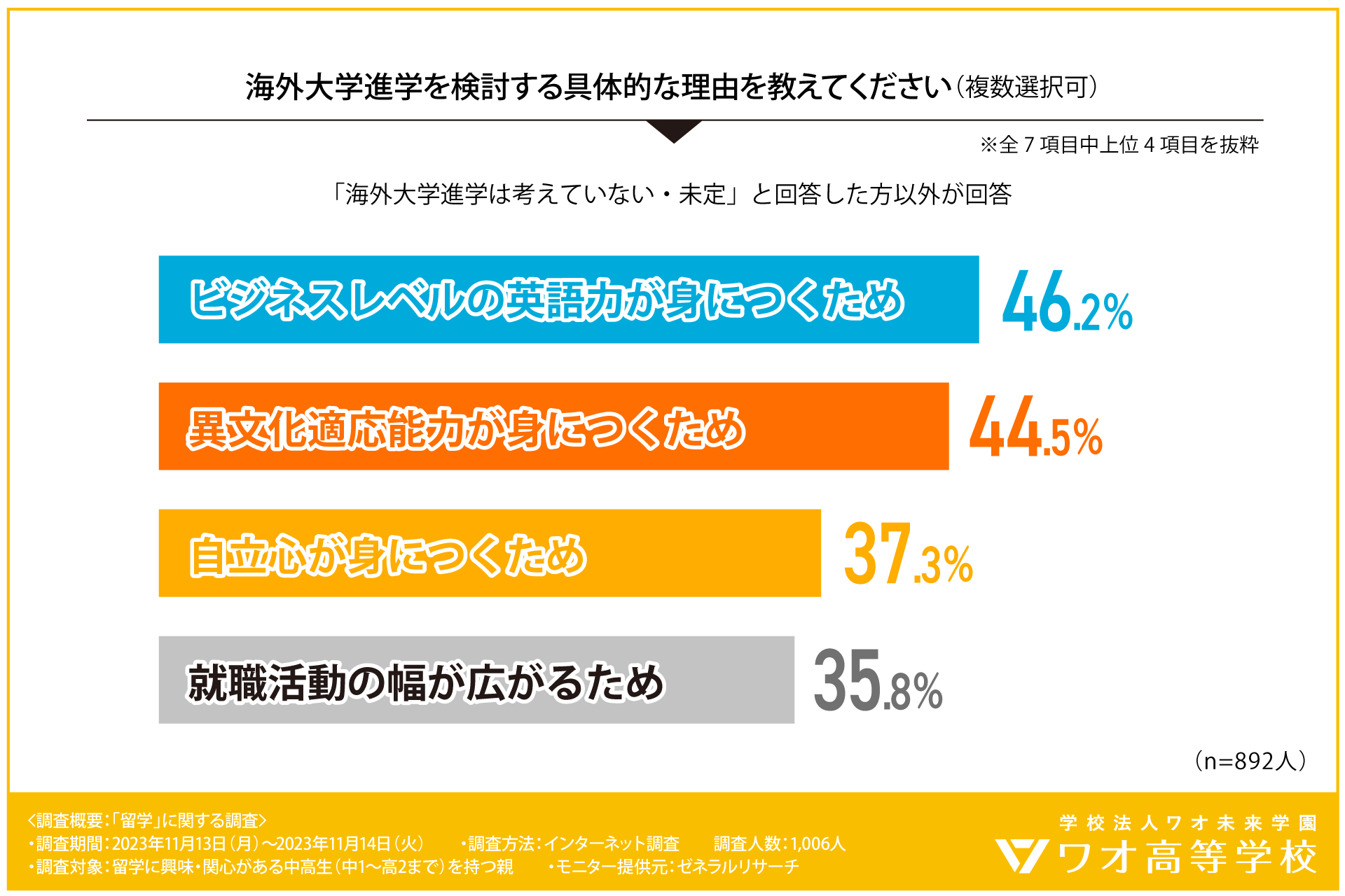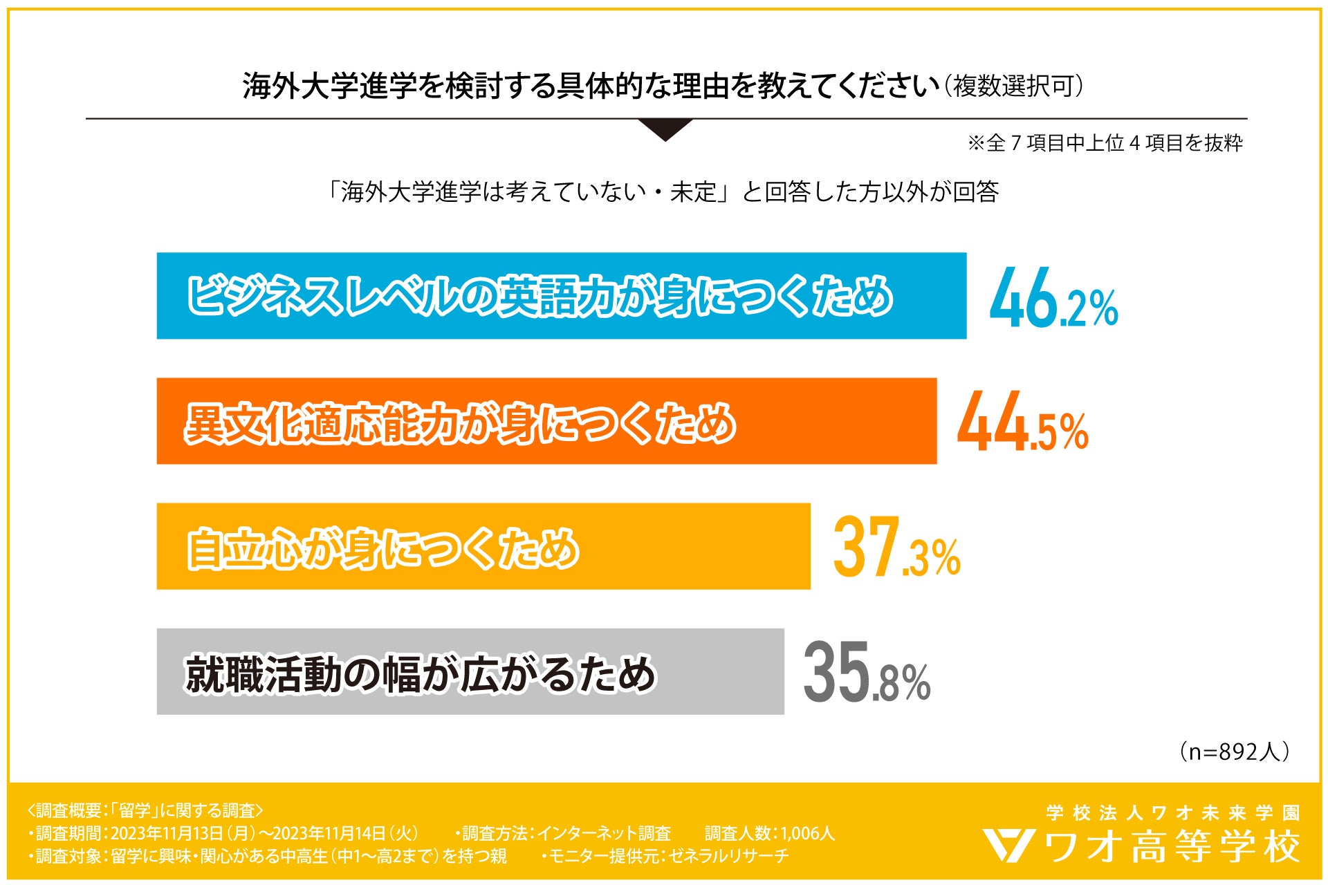 海外大学進学を検討する理由は、『ビジネスレベルの英語力が身につくため(46.2%)』『異文化適応能力が身につくため(44.5%)』。