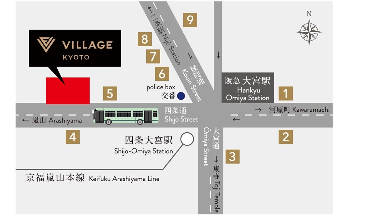 ヴィラージュ京都は、嵐山の玄関口"四条大宮"に位置しており、阪急京都本線「大宮駅」、京福嵐山本線「四条大宮駅」、バス停「四条大宮」から徒歩2〜3分のロケーションで、観光の拠点として利便性の高い場所にあります。嵐山をはじめ、清水寺や八坂神社、平安神宮へも乗り換えなしで向かうことができ、アクセスは快適です。