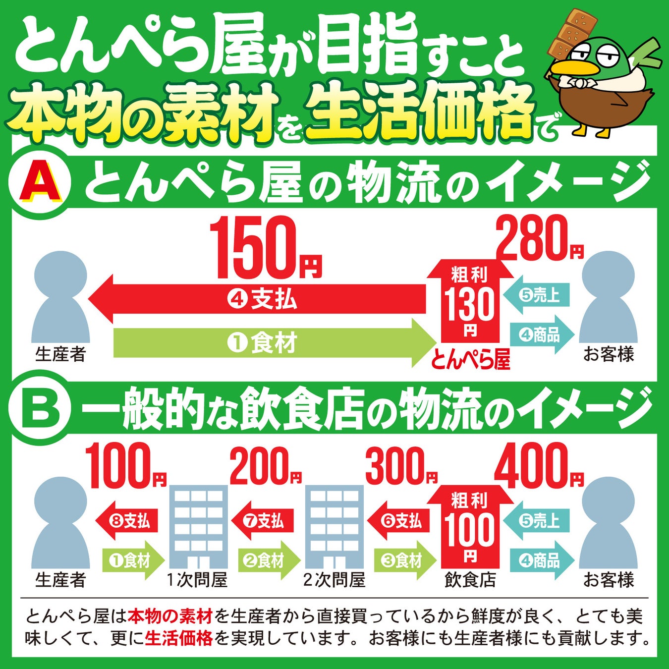 『とんぺら屋』は、全国150店舗展開する居酒屋『新時代』の姉妹ブランドです。名物商品は、新時代の名物『伝串』と同じ味付けの『とんぺら焼き』です。注文率は100%を超え、1本90円で販売しております。1本90円で楽しめる『とんぺら焼き』は見た目も味も好評で、芸術品とまで言われております。