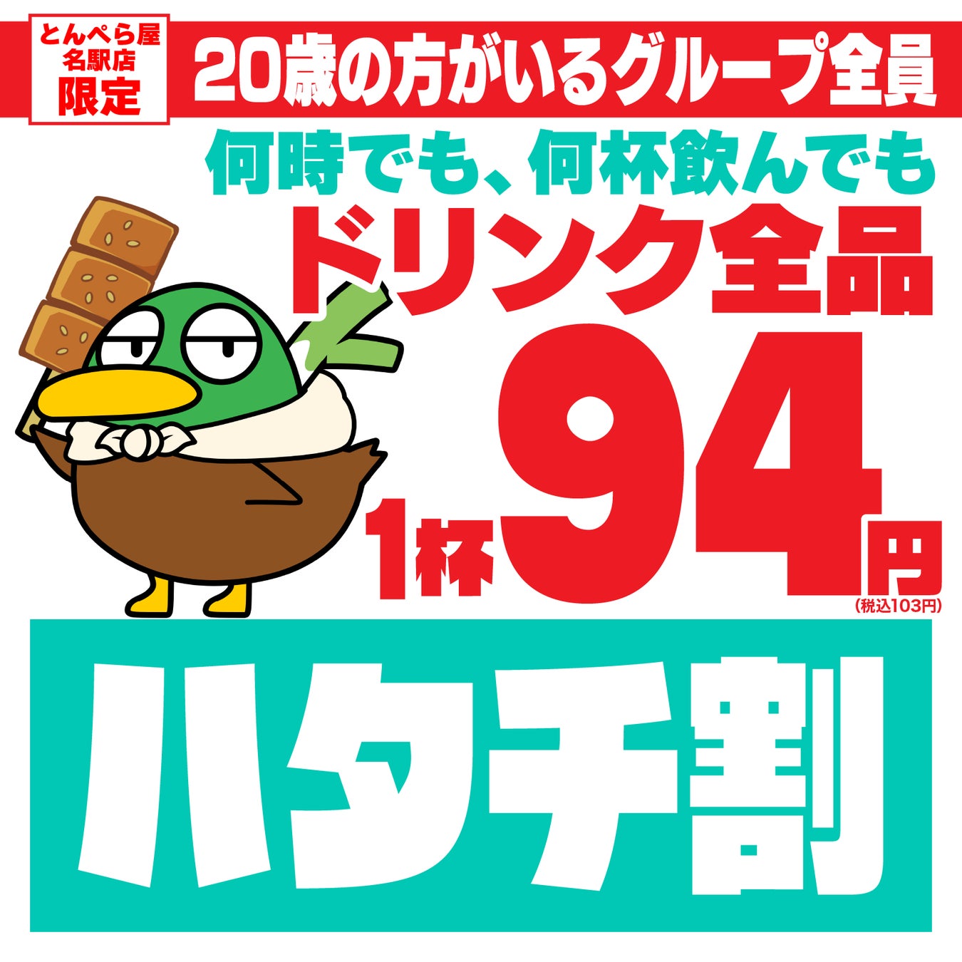 新時代の姉妹ブランド『とんぺら屋 名駅店』ハタチ割を実施!20歳の方がいるグループ全員、ドリンク全品94円