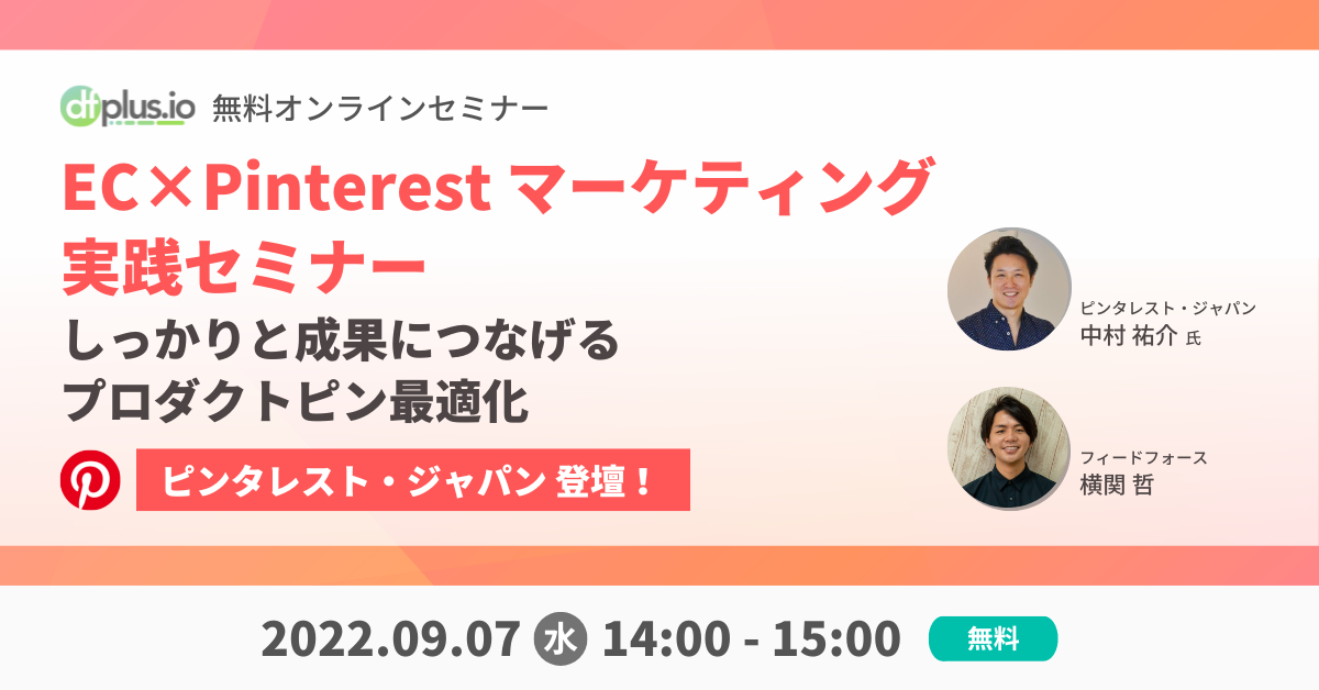 株式会社フィードフォース(所在地:東京都文京区、代表取締役:塚田 耕司、以下「フィードフォース」)が提供する、マーケターのためのデータフィード管理ツール「dfplus.io」は、無料オンラインセミナー「EC×Pinterestマーケティング実践セミナー しっかりと成果につなげるプロダクトピン最適化」を2022年9月7日(水)に開催いたします。