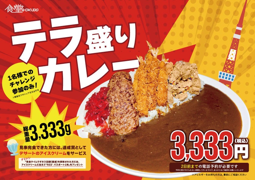「RED゜ SHOKUDO」では、東京タワーの高さ333mにちなんだ、総重量3,333gの超大盛りメニュー「テラ盛りカレー」の販売を開始します。