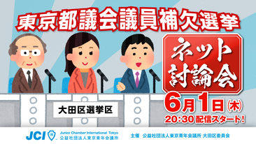 公益社団法⼈東京⻘年会議所(所在地:東京都千代⽥区平河町、理事⻑:下⼭⽥ 敬介) 大田区委員会は、東京都議会議員補欠選挙の公開討論会を6⽉1⽇(月)20時30分よりニコニコ生放送にて⽣配信いたします。