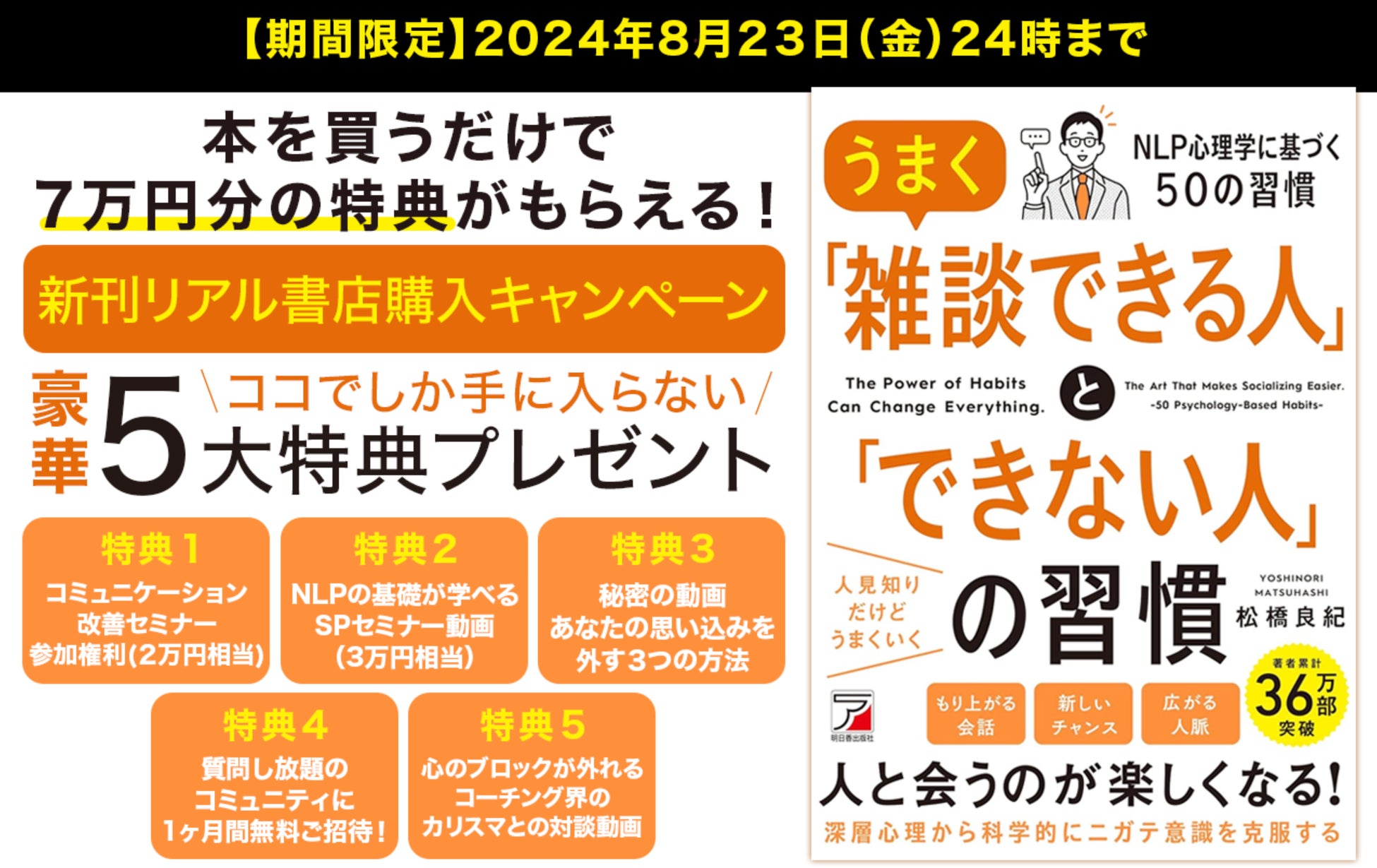 【雑談がニガテな人必見】書店で購入するだけで7万円分の特典がもらえる!『うまく「雑談できる人」と「できない人」の習慣』期間限定キャンペーン開催中!