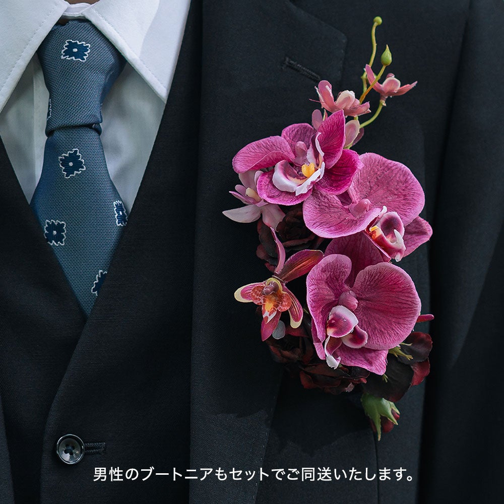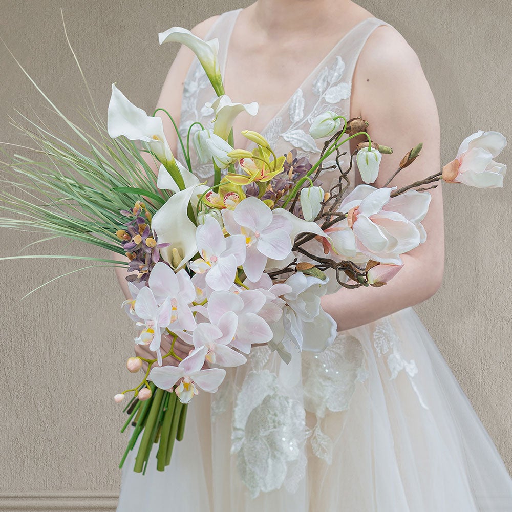 洋花と和花を絶妙にミックスした、和装にも洋装にも映える万能ブーケ。ハクモクレンや胡蝶蘭などの和の要素を取り入れつつ、モダンな色使いで華やかさをプラス。アーティフィシャルならではの自由な組み合わせで、伝統と新しさが調和した一束に。和洋折衷のスタイルにぴったりです。※ヘアードと男性用のブートニアもセットで同送いたします。