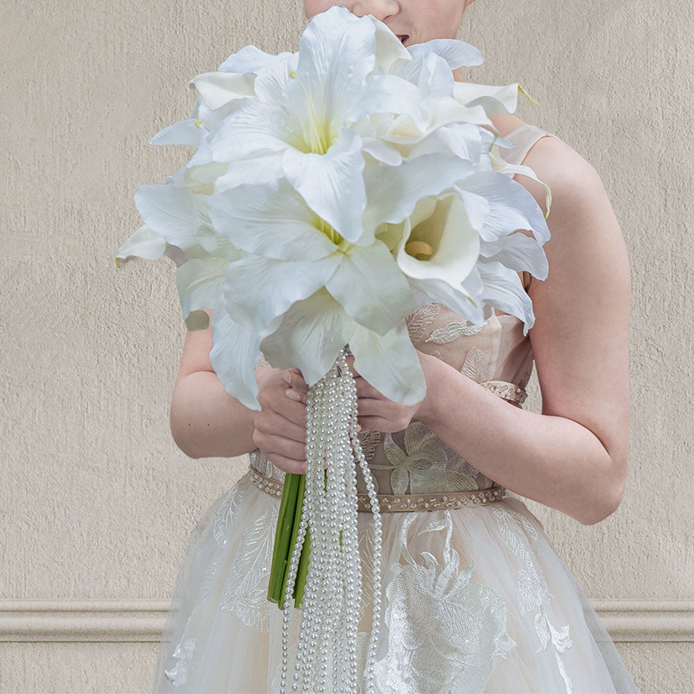 純白のユリとカラーをふんわりと束ねた、優雅で清らかな印象のブーケ。丸みのあるシルエットが柔らかさを演出し、花嫁の手元にそっと寄り添います。アーティフィシャルならではの繊細な質感で、写真映えも抜群。清楚で上品なスタイルにぴったりの一束です。※男性用のブートニアもセットで同送いたします。