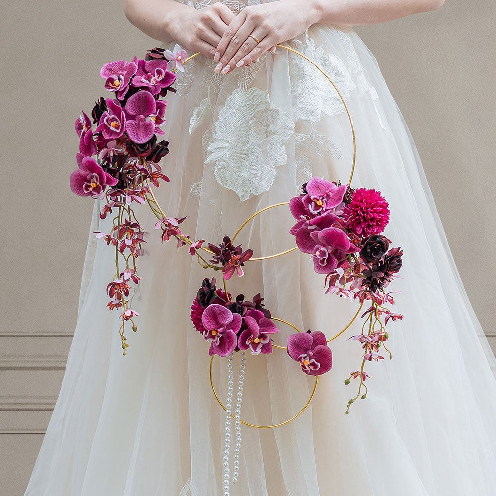 リング状のパーツを組み合わせた、アート感あふれる個性派ブーケ。パープルを基調にした色使いが情熱的で魅力的。構築的なフォルムが、スタイリッシュな花嫁の手元を彩ります。アーティフィシャルだからこそ実現できる造形美で、写真にも映える存在感たっぷりの一束です。※男性用のブートニアもセットで同送いたします。