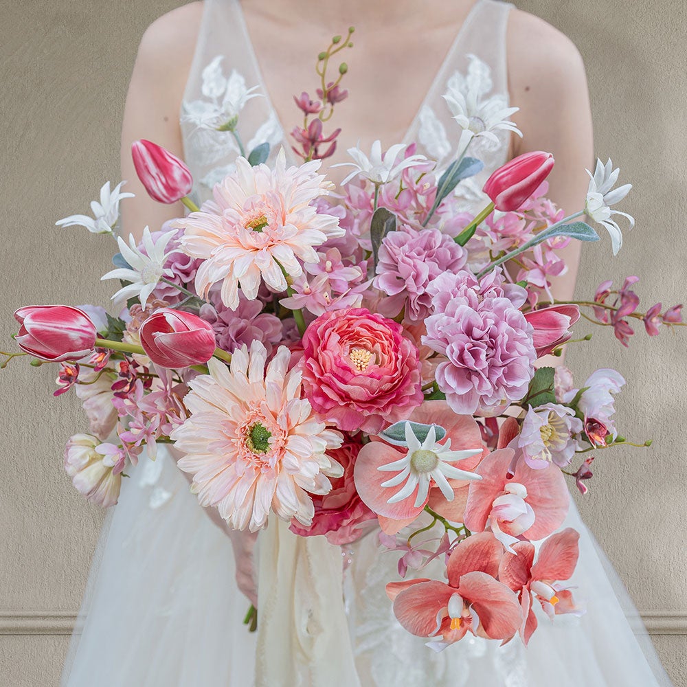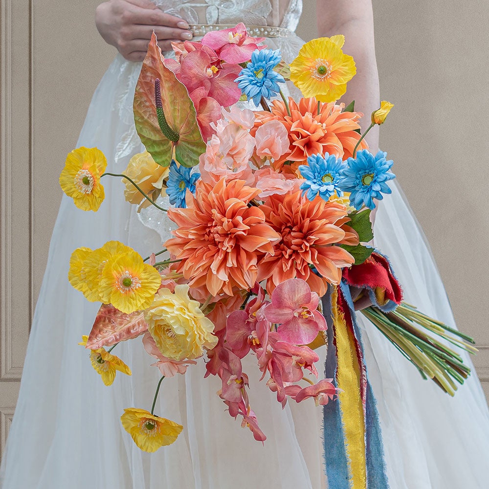 ビビッドな色彩と遊び心あふれるデザインが魅力の、カラフルPOPなアーティフィシャルブーケ。ピンク・イエロー・ブルーなど多彩なカラーを大胆に組み合わせ、見る人の心をパッと明るく照らします。写真映えはもちろん、個性を大切にしたい花嫁にぴったりの一束。元気でハッピーな空気をまとって、特別な一日をもっと楽しく!※男性用のブートニアもセットで同送いたします。