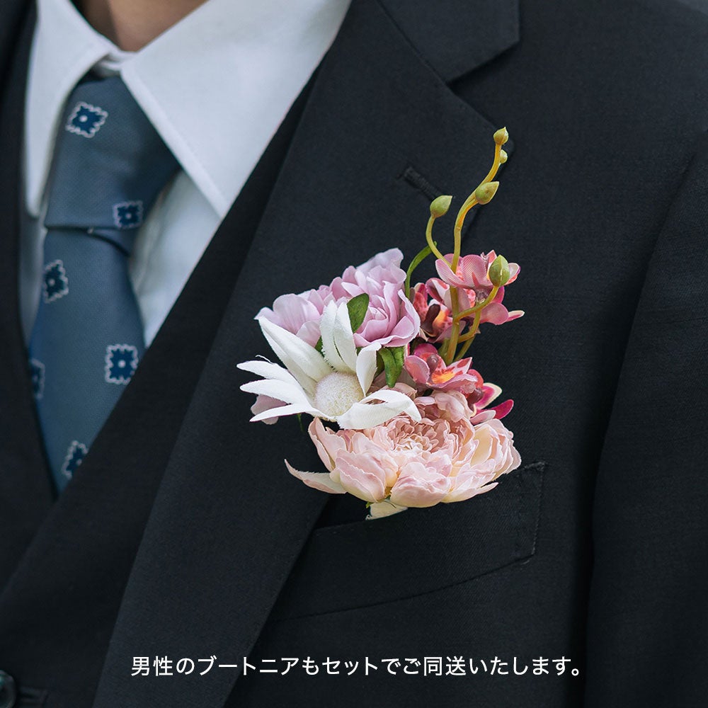 淡いピンクを中心に、優しさと可愛らしさをぎゅっと詰め込んだブーケ。丸みのあるフォルムと柔らかな色合いが、花嫁の可憐な魅力を引き立てます。アーティフィシャルフラワーならではのふんわりとした質感で、長時間の撮影でも美しさをキープ。愛らしさを大切にしたい方におすすめです。※男性用のブートニアもセットで同送いたします。