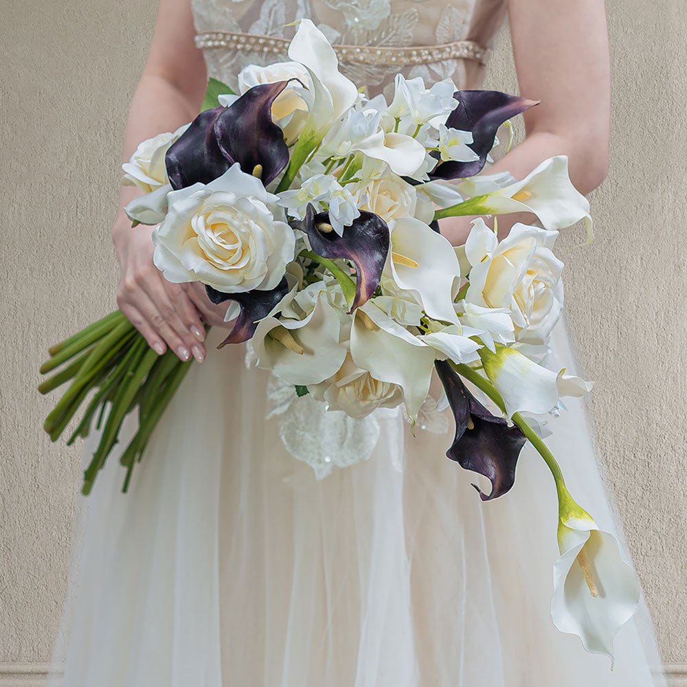 すらりとしたカラーが主役の、洗練された大人のためのブーケ。落ち着いた色合いとすっきりしたフォルムが、凛とした美しさを引き立てます。アーティフィシャルフラワーならではの質感で、品格あるスタイルを長く楽しめるのも魅力。シンプルで上質な一束をお探しの方へ。※男性用のブートニアもセットで同送いたします。