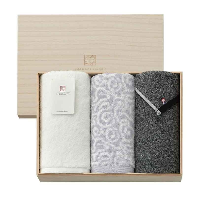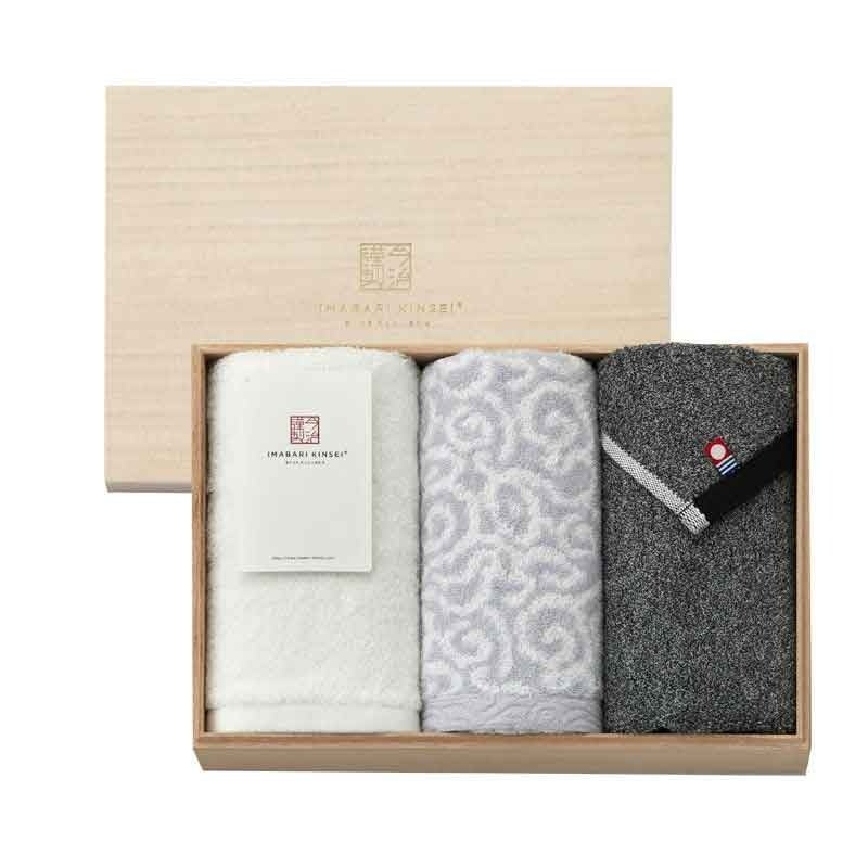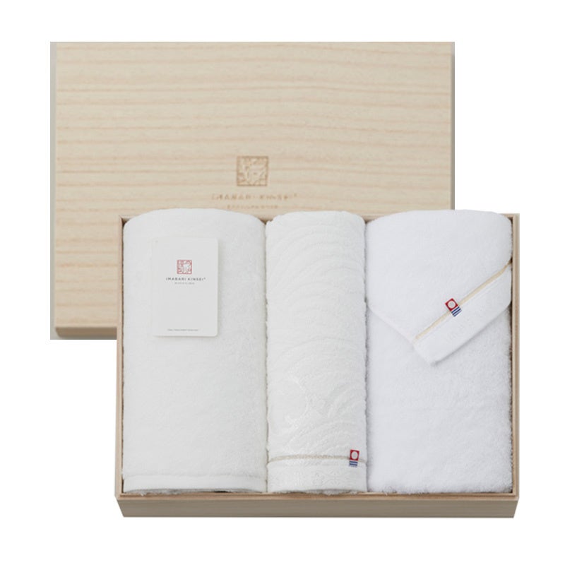 歴史あるタオルの町「今治」。染め、織り、洗い等の多くの工程に知恵と技術が息づき、伝統を受け継ぐだけでなくその技術を弛まぬ努力で発展させる職人達。そんな今治の匠の技で織りあげたタオルを格調高い木箱にお詰めしたのが「今治謹製」の始まりです。