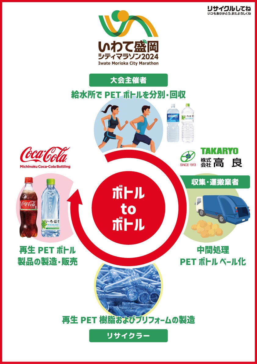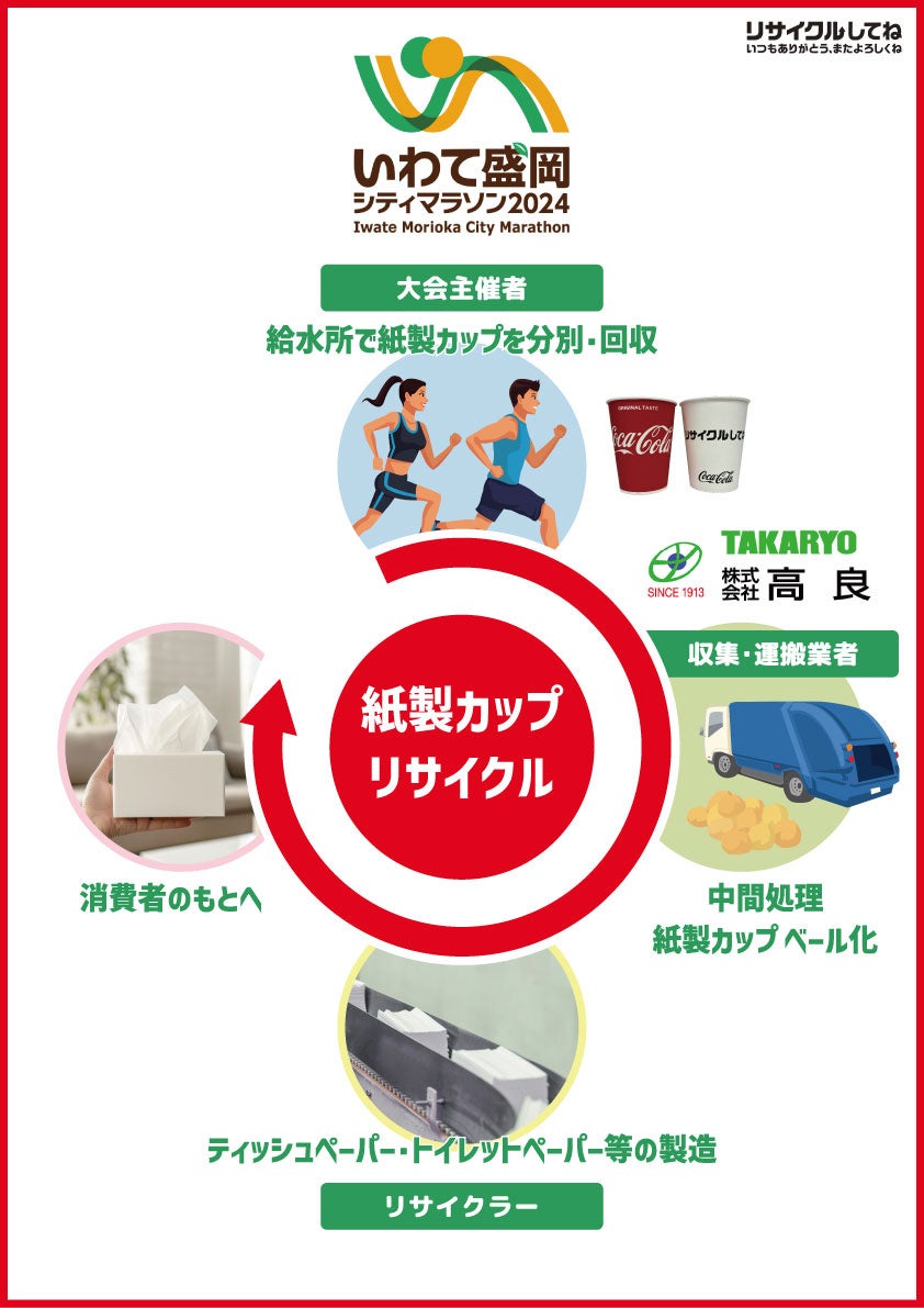 みちのくコカ・コーラボトリング株式会社(本社: 岩手県盛岡市、代表取締役社長:谷村 広和、以下「当社」)は、オフィシャルドリンクパートナーを務める「いわて盛岡シティマラソン2024」において、いわて盛岡シティマラソン実行委員会および株式会社高良(本社:福島県南相馬市、代表取締役社長:高橋 隆助、以下「高良」)と協働し、「PETボトルの水平リサイクル・紙製カップリサイクル」の取り組みを実施いたします。