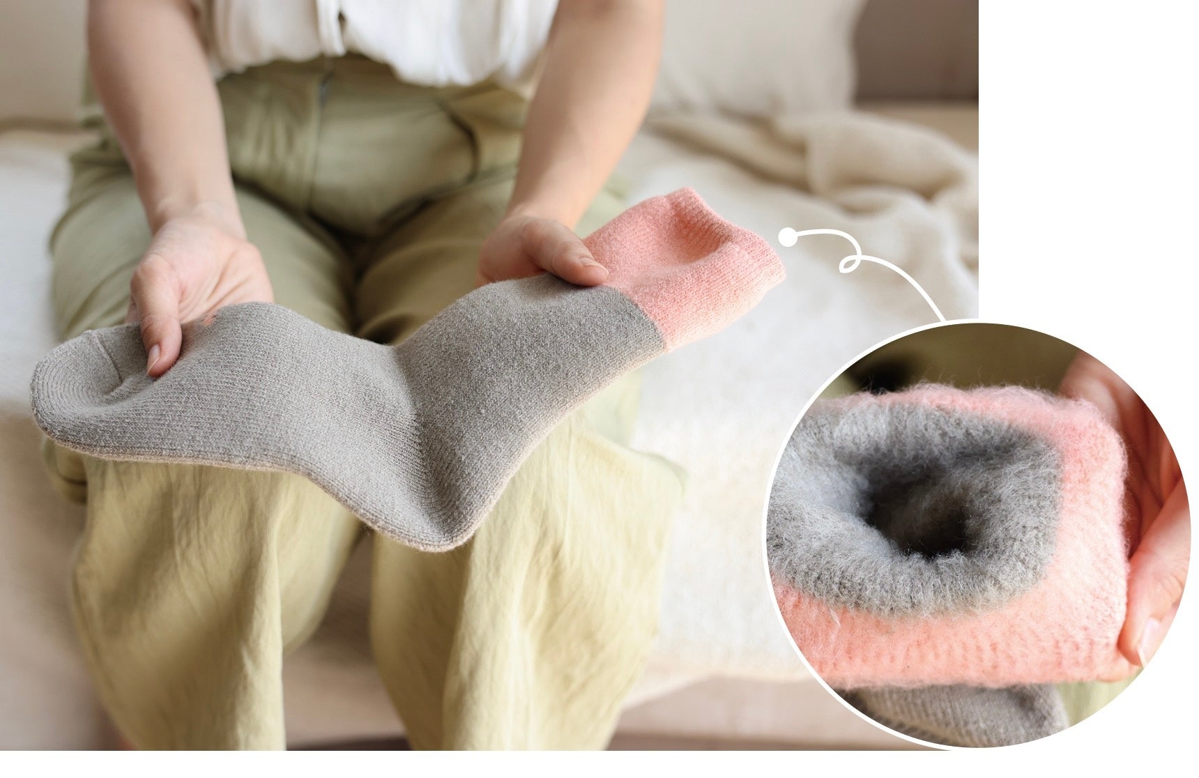 保温性をアップさせる加工を施した糸でふんわり編み上げた靴下は、特に冷えやすい足元を冷気から守ってくれます。