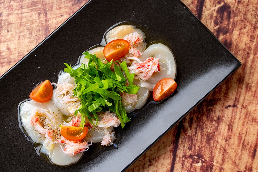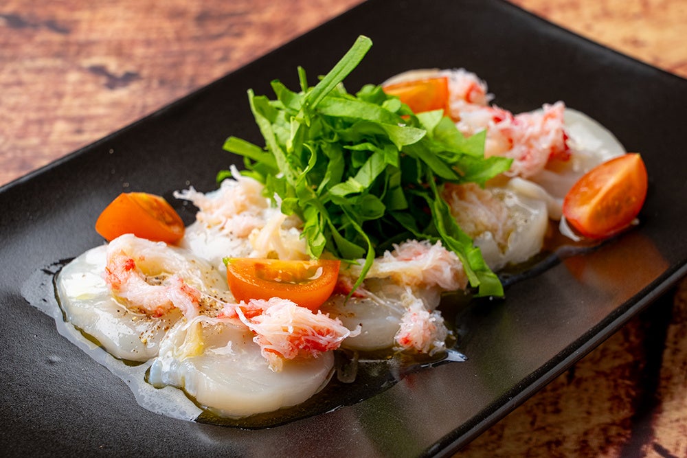大粒でプリップリの帆立に紅ズワイガニをプラスした豪華カルパッチョはレモンドレッシングでさらに甘く美味しく楽しめる!