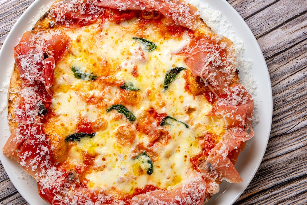 耳まで楽しむ!生ハムどっさり豪華ピッツァ!人気№1ピッツァの「北海道マルゲリータ」のコルニチョーネ(フチ)に生ハムをのせた贅沢ピッツァ!