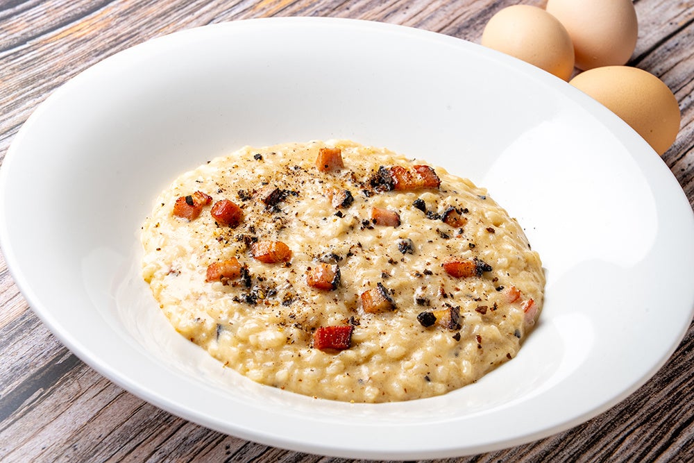 お客様の前で仕上げます!スパゲティで人気のカルボナーラをリゾットで再現!