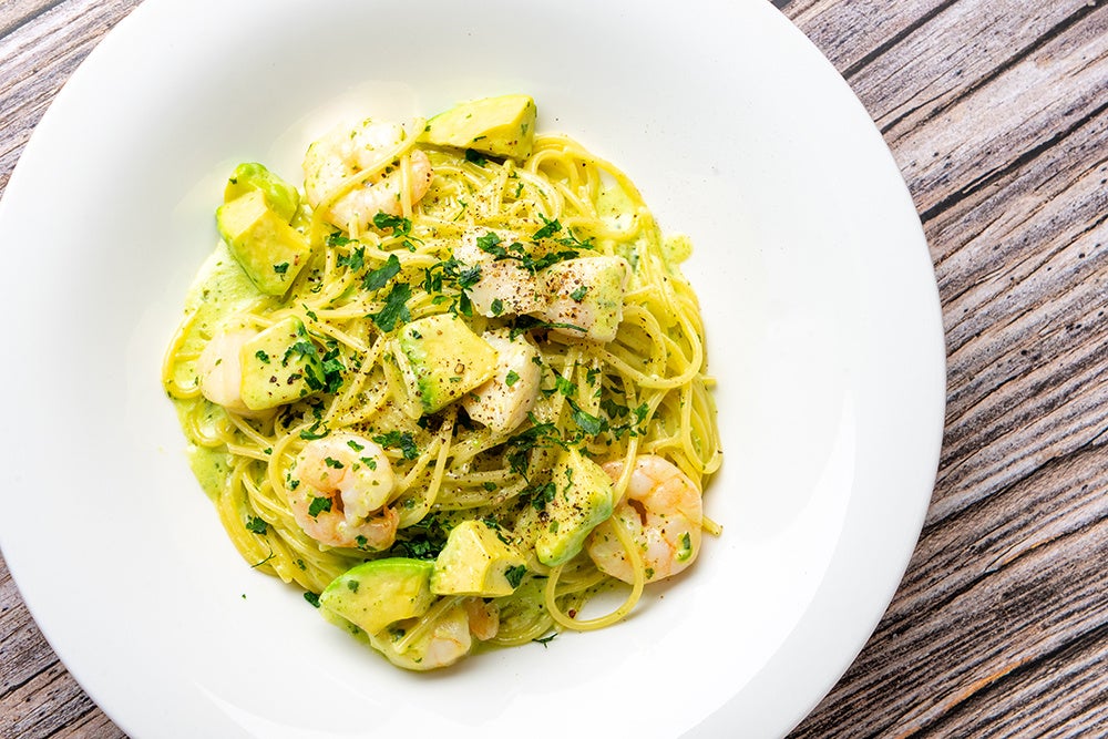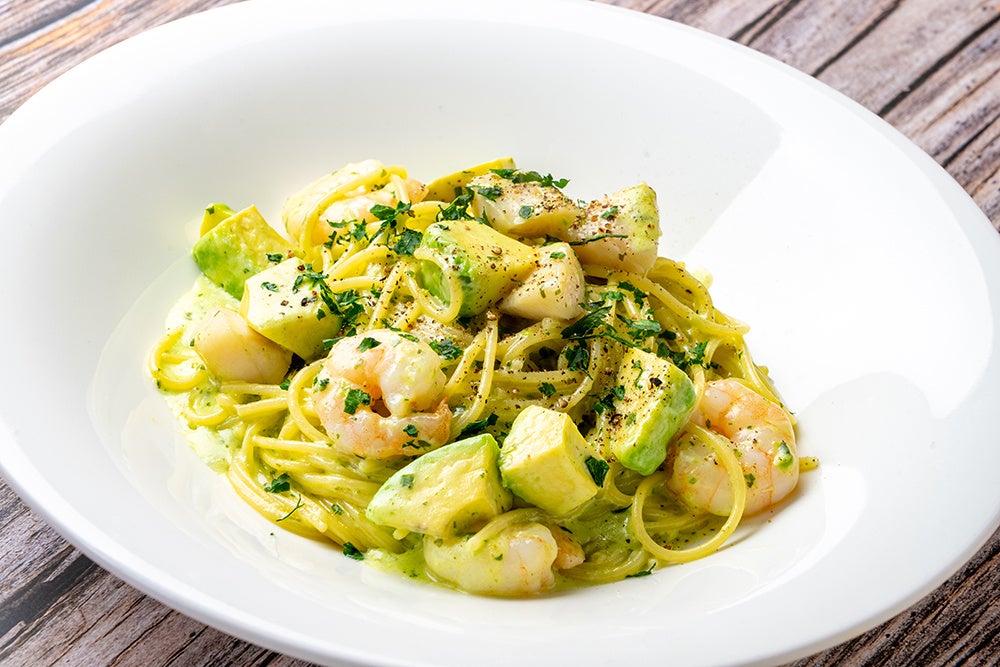 【メニュー名】北海道常呂産ホタテと海老、アボカドのバジルクリームスパゲティ