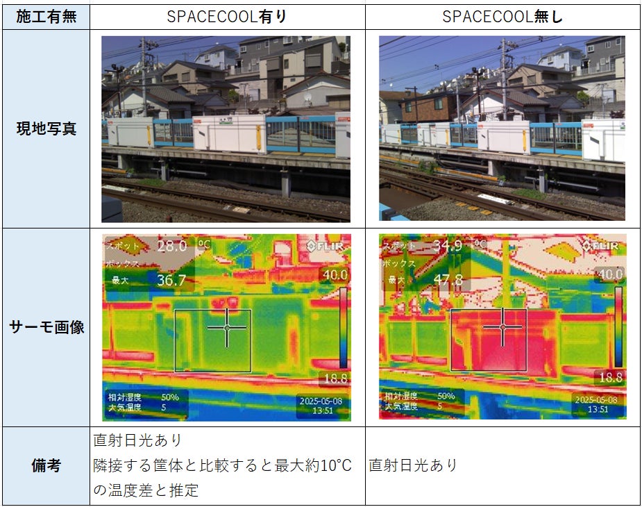 このような課題に対し、屋外電気設備を多数保有するJR東日本と共同で、今後設置駅数が約2倍に増加するホームドアに着目し、地球温暖化への適応を目的とした実証を本プログラムの中で実施しました。具体的には、ゼロエネルギーで冷却が可能な放射冷却素材「SPACECOOL」をホームドアの機器部に導入し、施工性、耐久性、温度低減効果といった鉄道環境下での実用性を検証し、施工が現実的であること、ならびに有意な温度低減効果が得られることをJR東日本とともに確認しました。これは、将来のリスクを事前に低減するための先行的な取り組みです。
