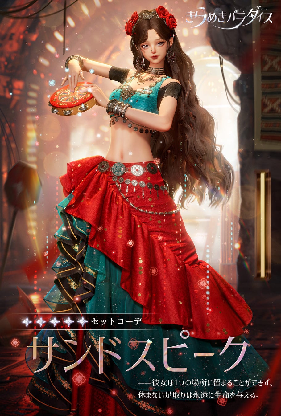 エスニック風のこのセットは金属の装飾が数多く施されており、フェスティバルをよりいっそう燃え上がらせるために欠かせない一着となっています。セットをコンプリートすると、所持品アイテムのタンバリンを鳴らす華麗なダンスの専用ポーズを獲得できます。