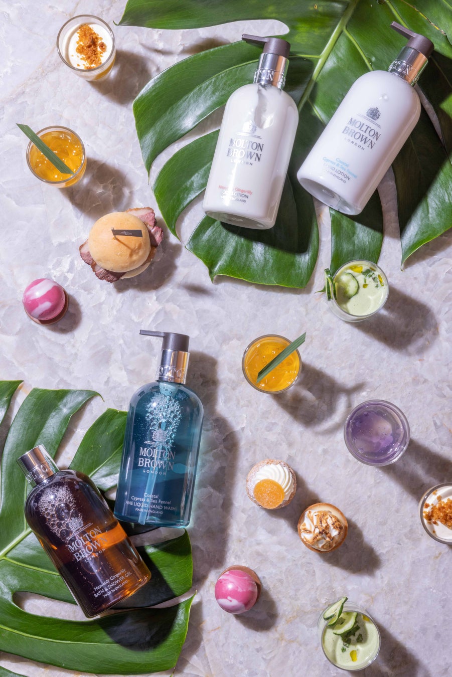 今回は、そんなモルトンブラウンの世界観を表現したコラボレーションアフタヌーンティーを1か月限定で展開。初夏の瑞々しさ、透明感をテーマにしつつ、モルトンブラウンのフレグランスコレクションからインスパイアを受けたオリジナリティあふれるメニューが並びます。また、数量限定でモルトンブラウンの人気アイテム「サイプレス&シーフェンネル」と「ジンジャーリリー」のバス&シャワージェル ミニボトルをプレゼント。清涼感あふれるアフタヌーンティーをぜひお楽しみください。