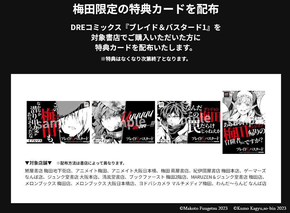 対象書店で『ブレイド&バスタード1』をご購入いただいた方に、梅田限定の特典カード(全4種)を配布いたします。