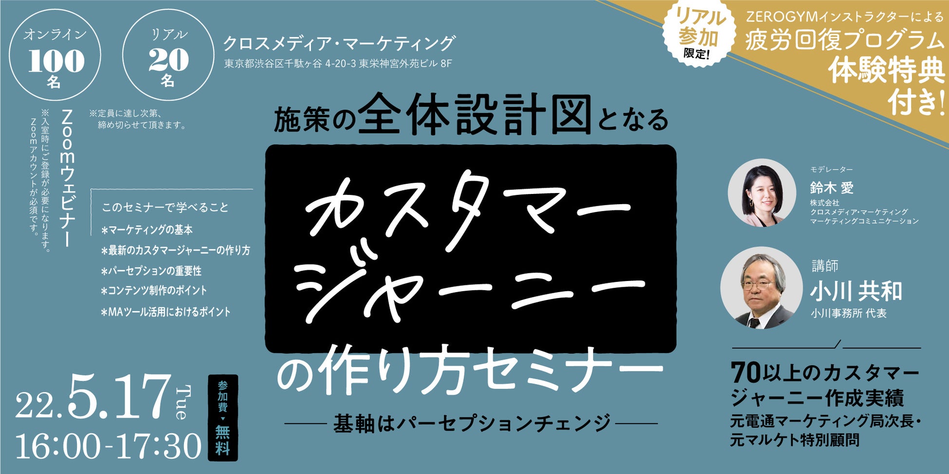 クロスメディアグループ(所在地:東京都渋谷区千駄ヶ谷 代表取締役:小早川幸一郎)のグループ会社である、株式会社クロスメディア・マーケティングは、2022年5月17日(火)小川事務所代表 小川共和氏による「施策の全体設計となるカスタマージャーニーの作り方セミナー」を開催致します。