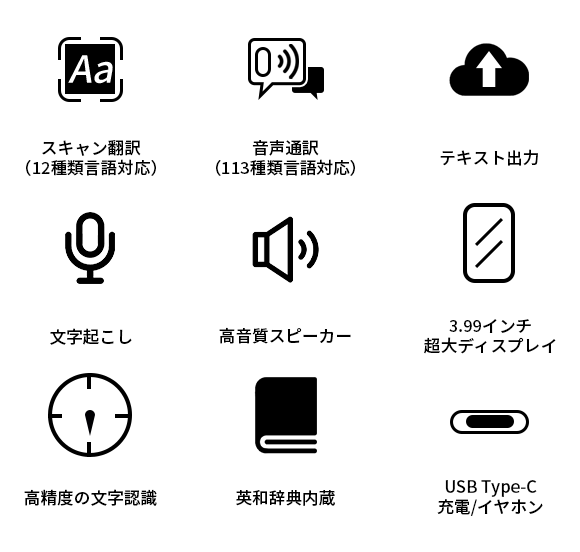 ①スキャン翻訳は日中英韓など最大で12種類の言語に対応!スキャンした文字をスマホにテキスト出力も可能!②双方向音声通訳は最大で113種類の言語に対応!外国に旅行・出張のお方にお勧め!