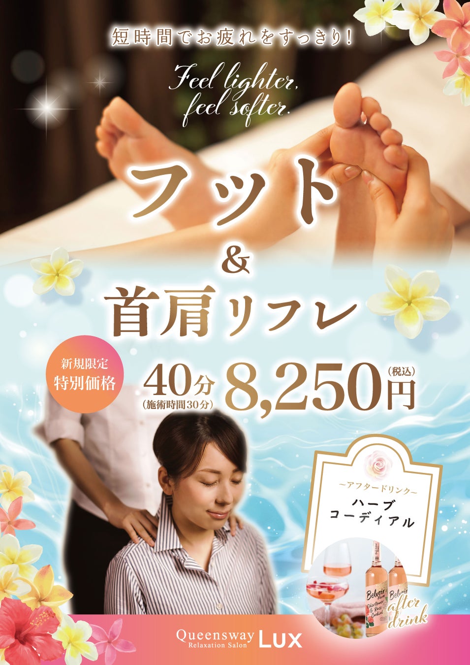 また、 QueenswayLUXでは新たに当店をご利用いただくお客様に向け、期間限定で【フット&首肩リフレ】プランをご提供いたします。