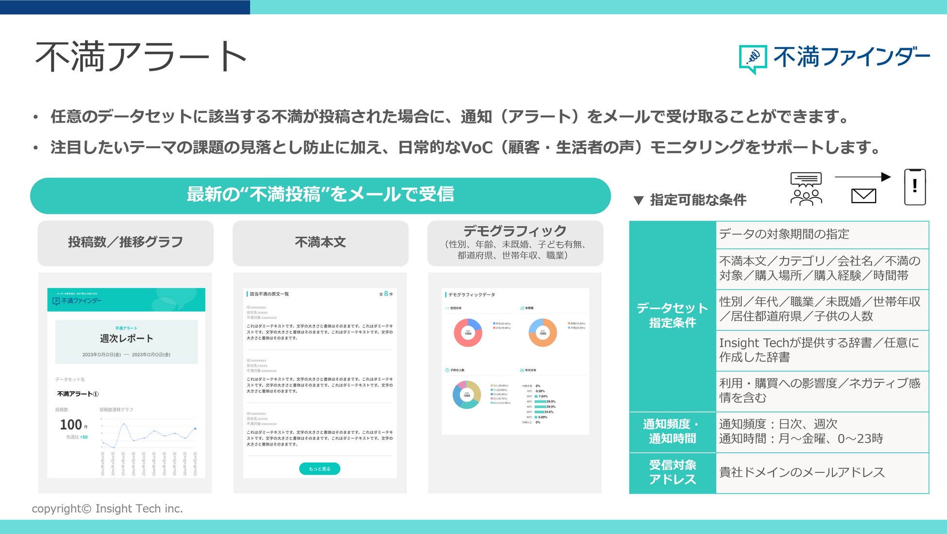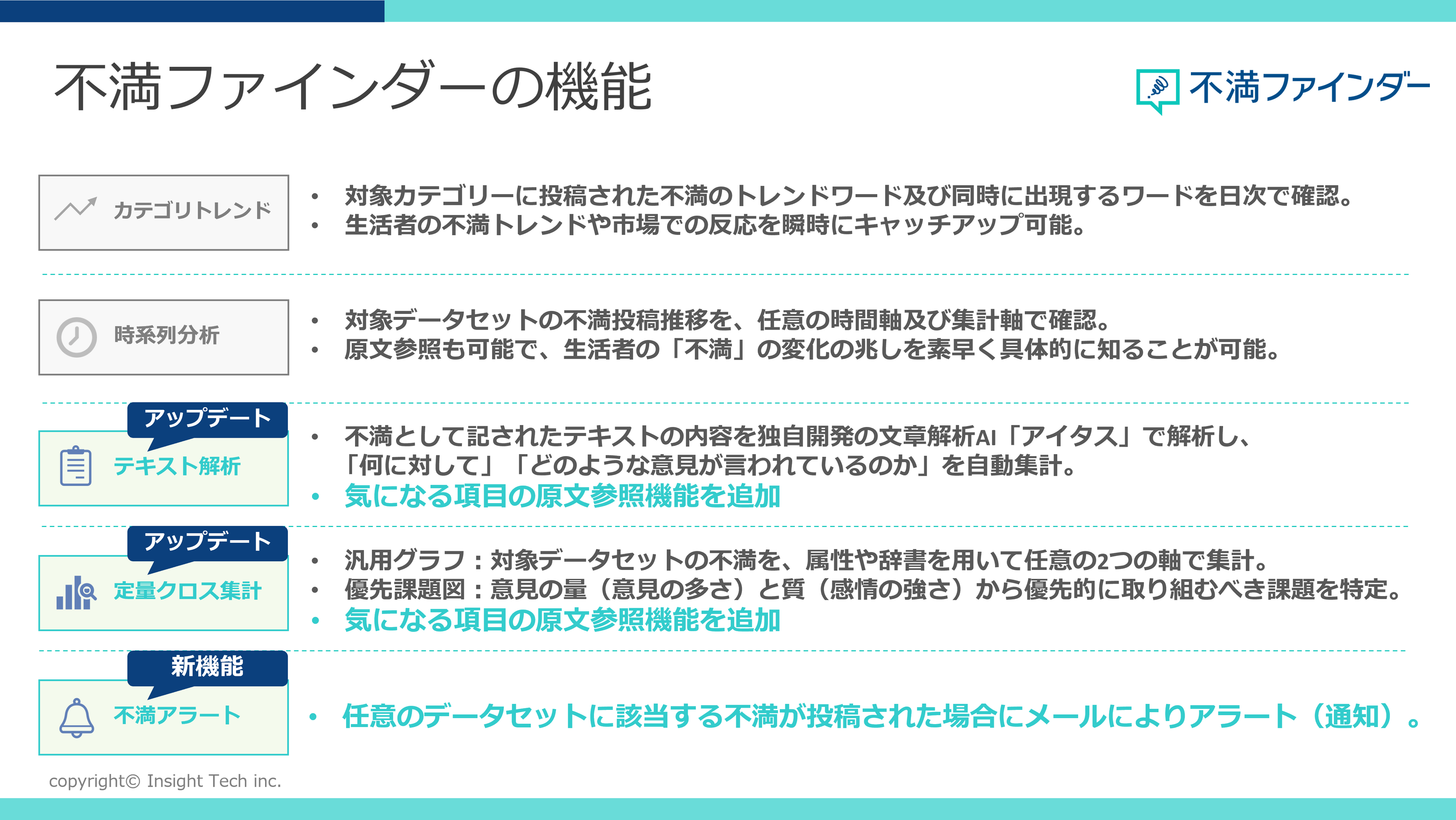 株式会社 Insight Tech(本社:東京都新宿区、代表取締役社長:伊藤友博)は、不満買取センターが独自に収集・蓄積する4,000万件超の「不満ビッグデータ」をいつでも自由に検索、任意の軸で解析できるSaaS「不満ファインダー」の機能を大幅アップデート致しました。
