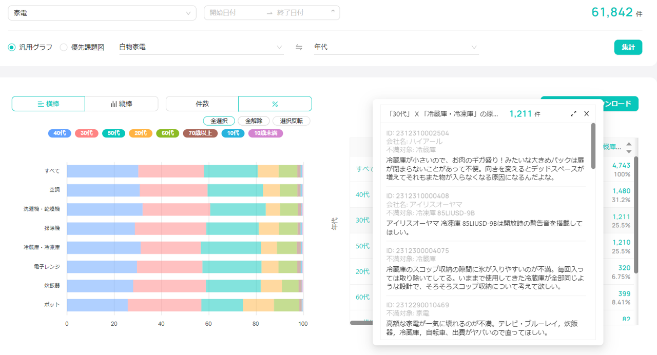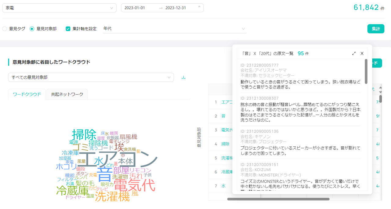 各解析結果画面に原⽂参照機能を追加しました。集計表内の各項目をクリックいただくことで該当する不満の原文を即座に確認いただけます。また、 表示された原文内からさらにキーワードによる絞り込みを行うことも可能です。