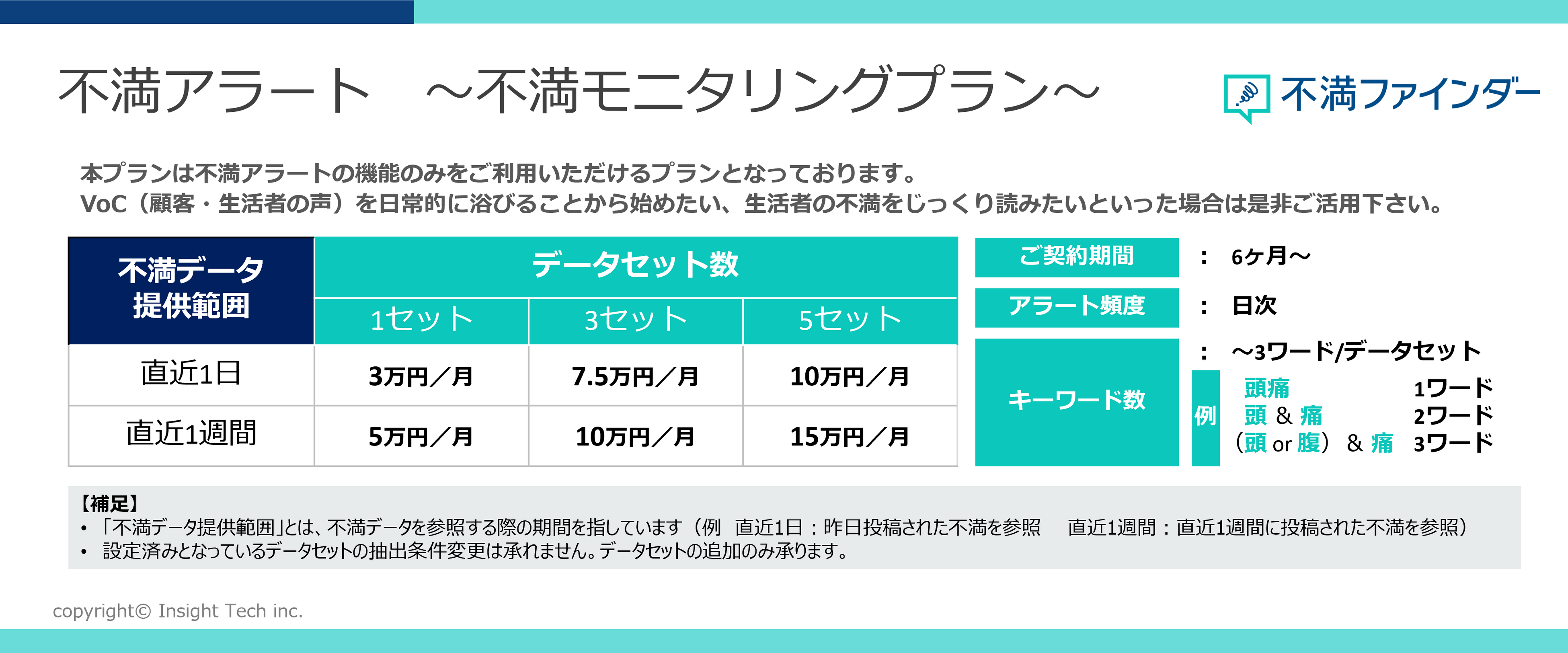 不満ファインダーアップデートを記念して、不満アラートの機能のみをご利用いただける特別プランを期間限定でご用意致しました。また、期間中に不満ファインダーをご発注いただいた場合は、ご利用期間を無料で1ヶ月延長致します。来期に向けたリサーチの方法をご検討中の皆様は、この機に是非ご活用ください。