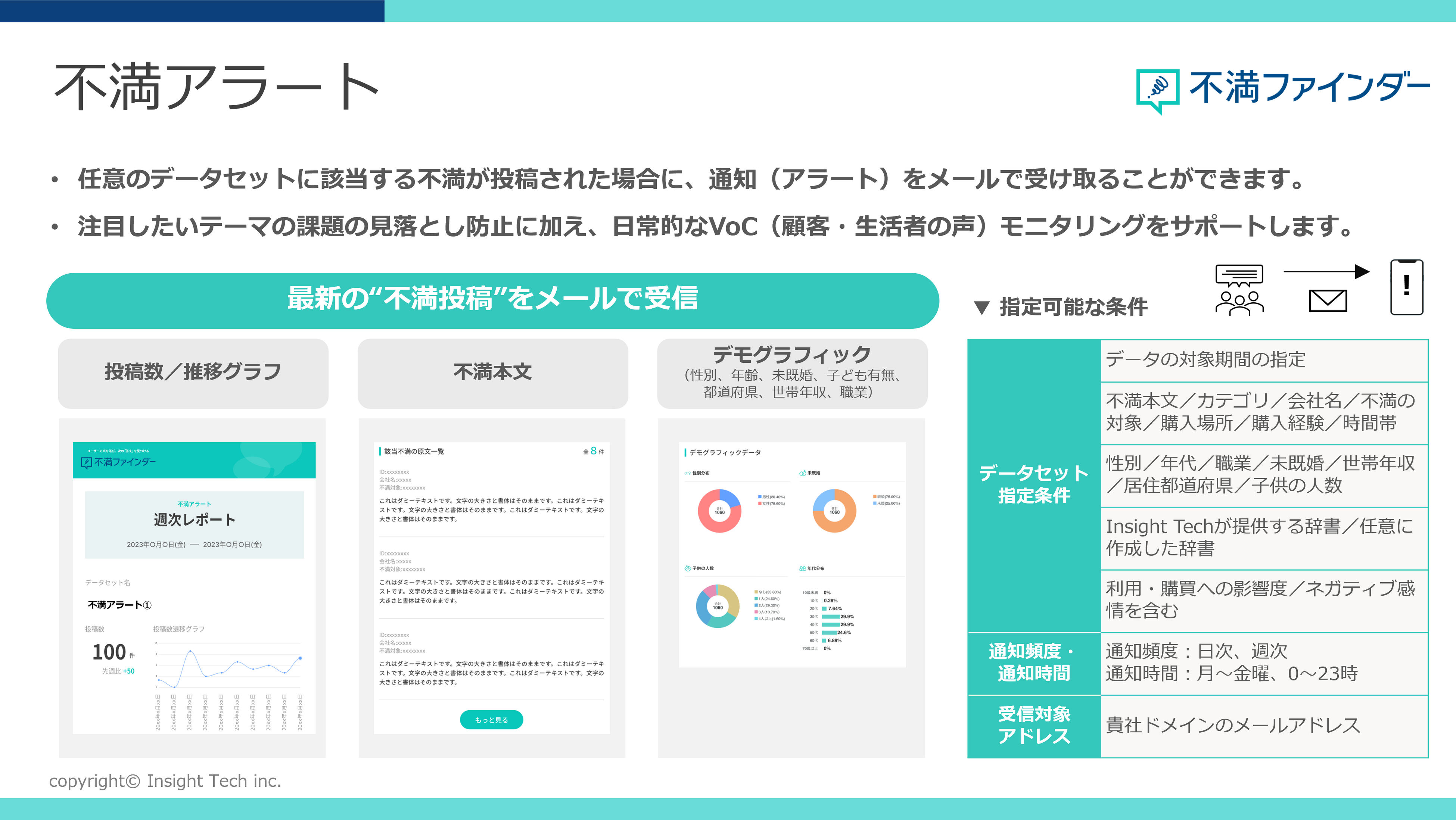 不満ファインダーは、商品・サービスの開発や改善ヒントとなる課題を抽出する目的で、多くの企業の皆様にご利用頂いております。日々のご意見交換の中で、一部の企業の皆様から、「ランキングや集計表で気になる結果が出たら、対象原文をすぐ確認できるようにして欲しい」「ニッチなテーマの不満が投稿されたらアラートを出して欲しい」「社員全員が日常的に生活者の声を浴びる・目にする仕組みが欲しい」といったお声を頂いておりました。