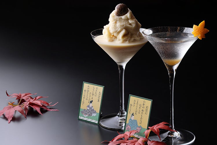 今回の『百人一首ランチ 秋の宴』では、百人一首の中で一番多く詠まれている秋の歌にちなんだ、色鮮やかで端正なお料理に、甘味は大津市にある「叶 匠壽庵(かのうしょうじゅあん)」による『あも歌留多』をお楽しみいただきます。また『百人一首カクテル』では、秋の情景が浮かぶ2首を選び新しいカクテルを考案。秋の実りを味わえる栗や柿のリキュールを使用したカクテルを創作しました。