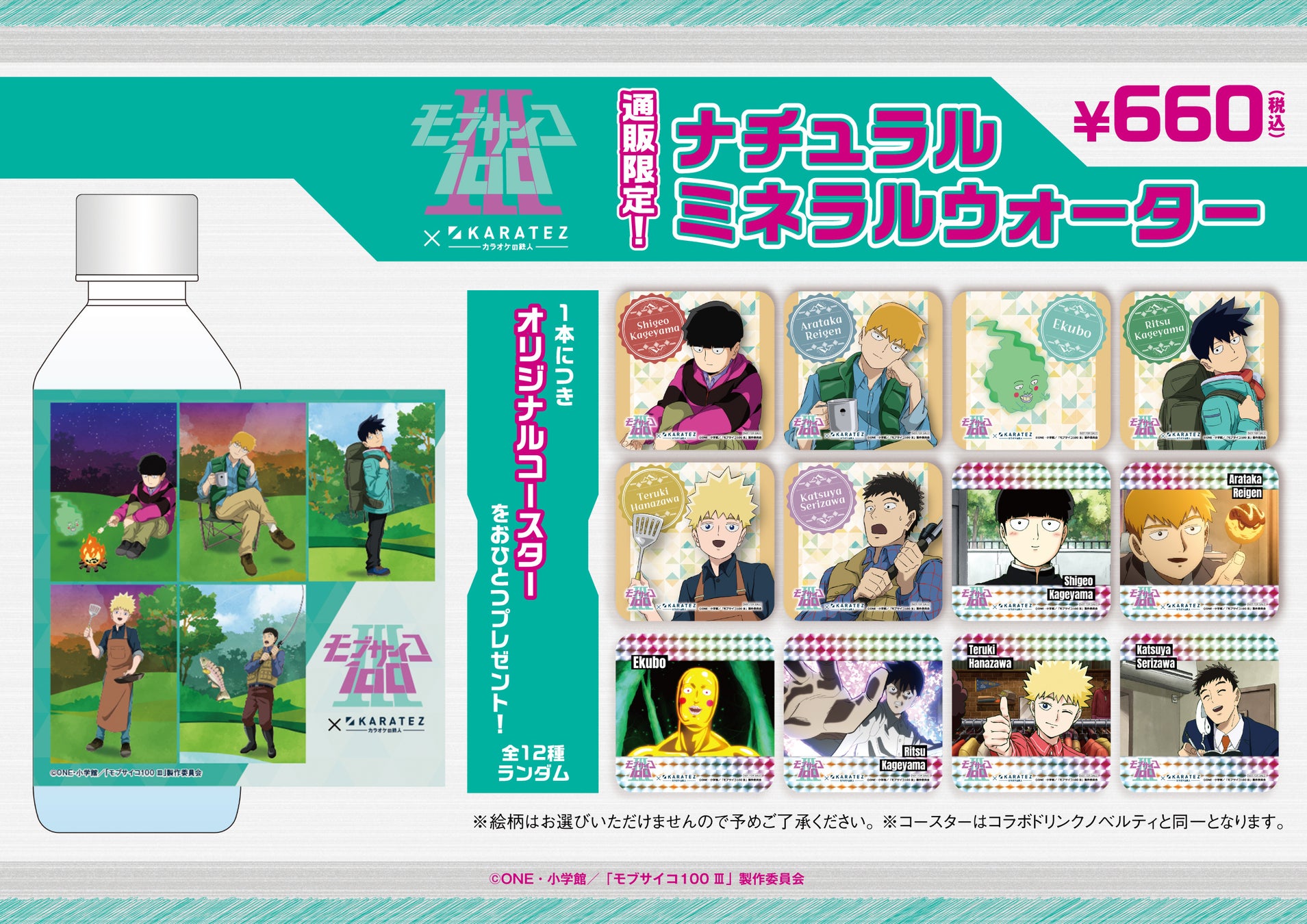 TVアニメ『モブサイコ100 Ⅲ』シリーズの完結を記念して、作品に登場するキャラクターたちの「ソロキャンプ」をテーマにした、カラオケの鉄人限定・描き下ろしイラストがコラボのノベルティやオリジナルグッズに登場します。