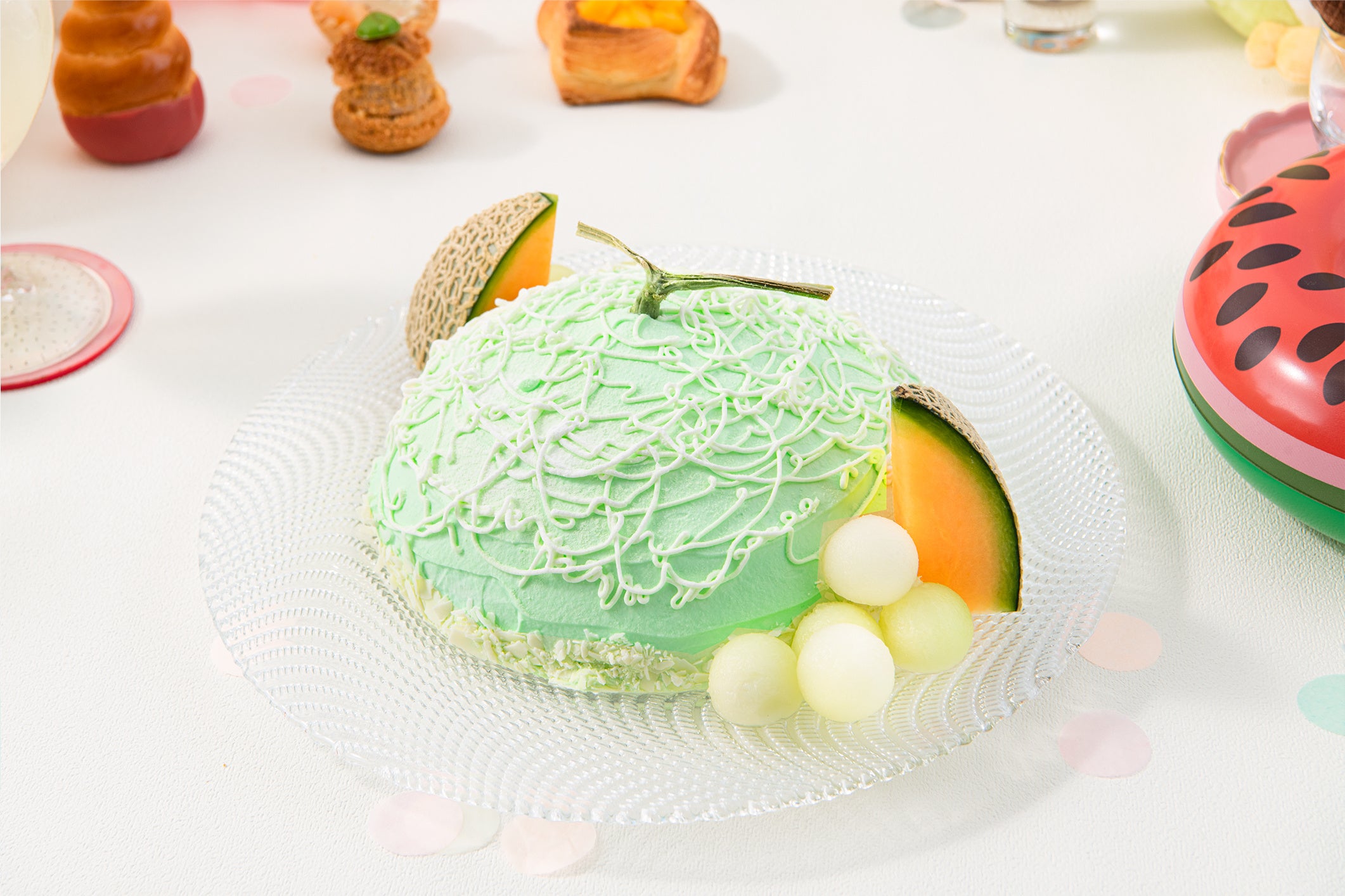 まるでメロンのようなケーキや、みずみずしいフルーツタルト、涼やかなフルーツポンチなど色鮮やかなスイーツがラインナップ!