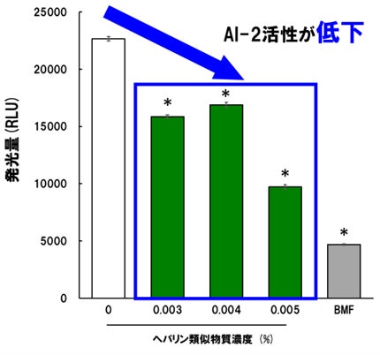 ヘパリン類似物質にアクネ菌が作り出すAI-2の阻害活性を認めたことから、実際にバイオフィルムの形成抑制につながるのか確認しました。アクネ菌にヘパリン類似物質を添加し、培養することにより、アクネ菌のバイオフィルム形成が抑制されました(図2)。このことから、ヘパリン類似物質はアクネ菌においてバイオフィルム形成に関与するAI-2を阻害し、バイオフィルムの形成を抑制していることが分かりました。