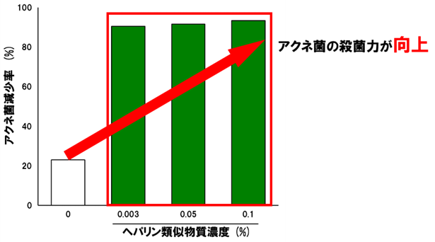 試験方法:ヘパリン類似物質を添加および未添加の培地でアクネ菌(Cutibacterium acnes NBRC107605株)を培養した。培養後、各試験菌に対しイソプロピルメチルフェノール溶液を30分間接触後、生菌数を測定して殺菌活性の算出をした。