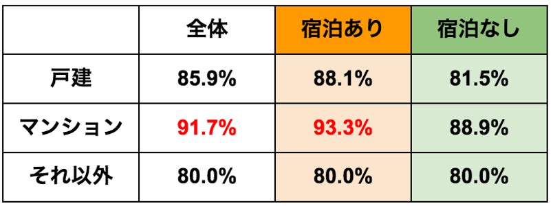 マンションでの手伝い率が最も高く、中でも宿泊ありの手伝い率が非常に高い93.3%でした。戸建でも宿泊ありの手伝い率は9割に迫る高さでした。