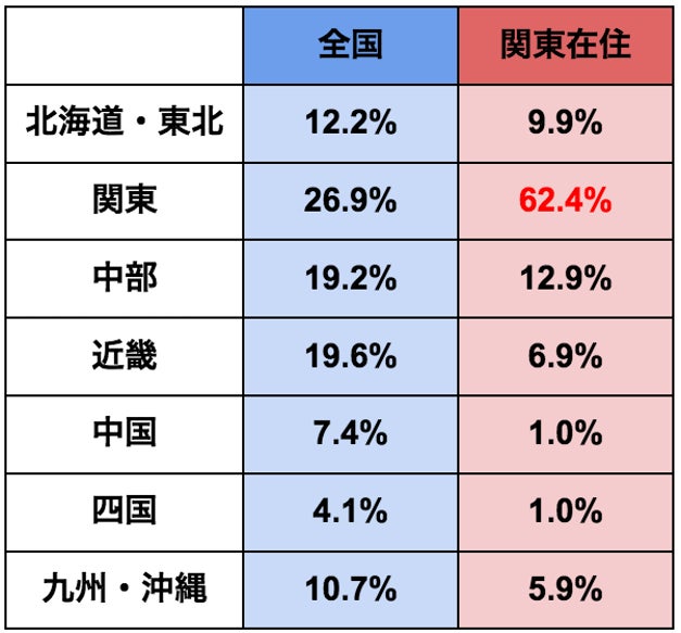 帰省先のエリア(全国)は、関東が3割弱、中部/近畿が約2割、北海道・東北/九州・沖縄が約1割、中国/四国が1割未満で、関東在住者は関東内での帰省が6割を超え、次に多い中部と合わせると関東から関東・中部に帰省する方が8割弱を占めていました。
