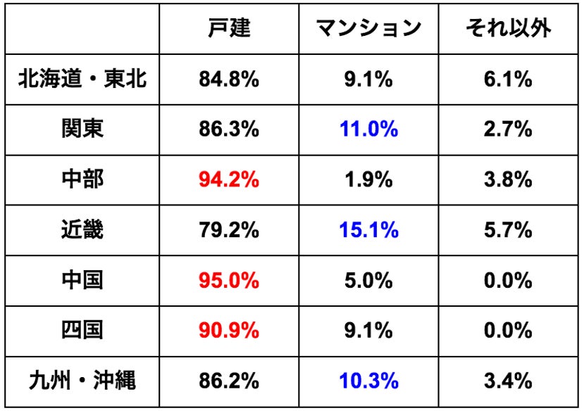 どのエリアも戸建が約8割またはそれ以上を占め、中部/中国/四国では9割を超えました。マンションは関東/近畿/九州・沖縄で1割台となりやや高めでした。