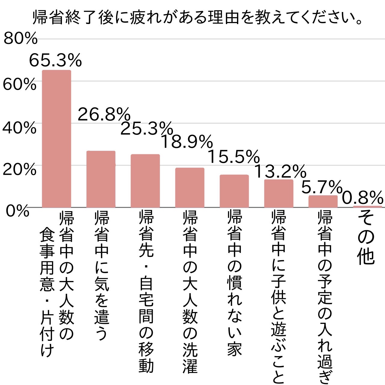 最も多かったのは「帰省中の大人数の食事用意・片付け」で7割弱でした。帰省してきた家族をもてなす場合はもちろん、帰省先で食事用意を手伝うことも疲れの理由となっている方が多いようです。家事に関しては「帰省中の大人数の洗濯」が大変という意見もありました。