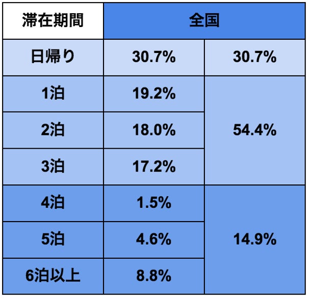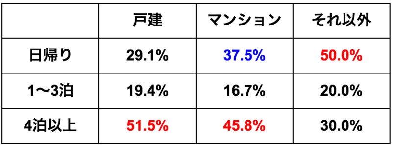 戸建・マンションでは約半数が4泊以上ですが、マンションでは4泊以上が減って日帰りが4割弱に増え、それ以外の住居では日帰り半数・4泊以上は3割にとどまりました。
