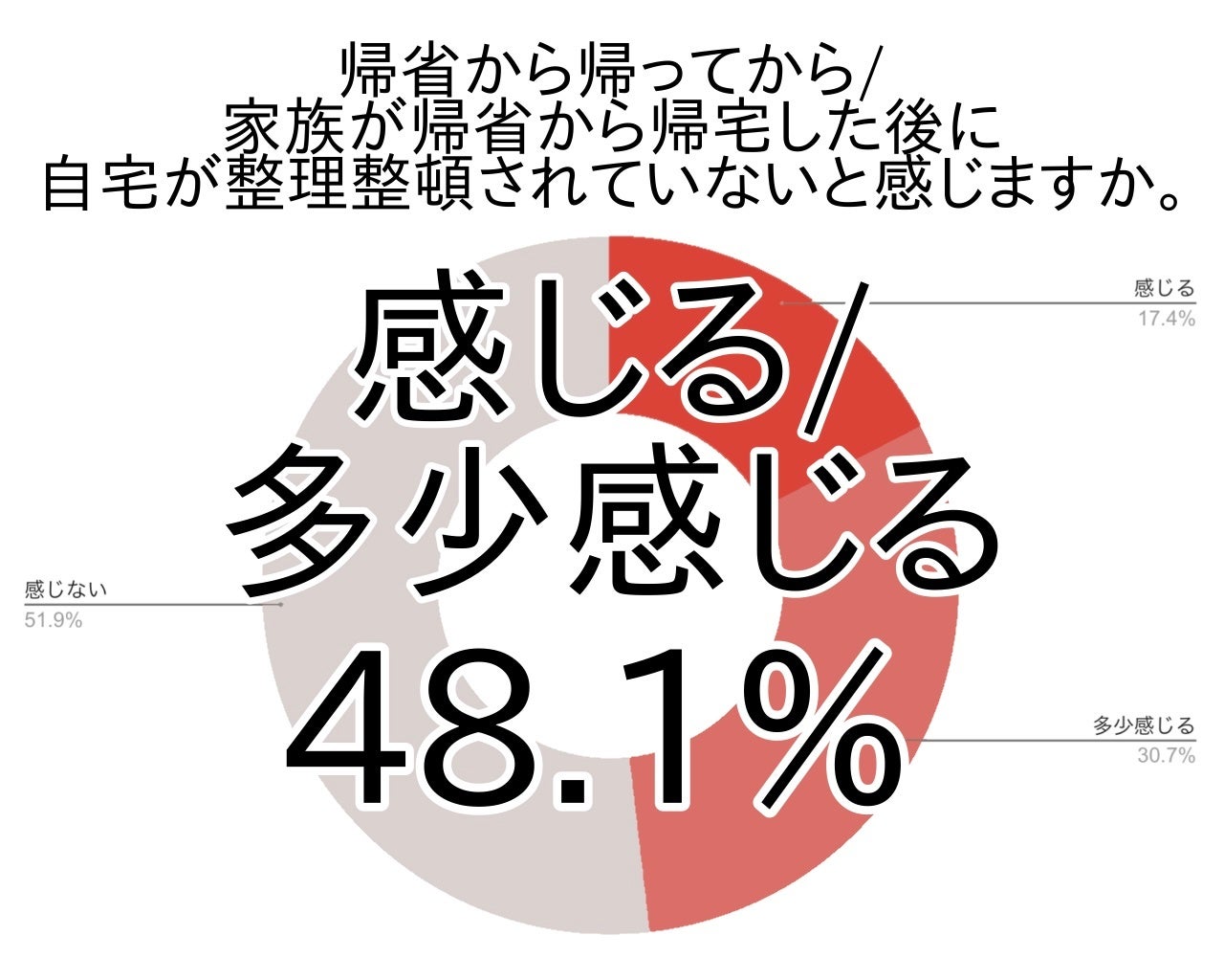 帰省から帰ってから/家族が帰省から帰宅した後に自宅が整理整頓されていないと感じる/多少感じると答えた方は約5割(全国48.1%・関東45.9%)でした。