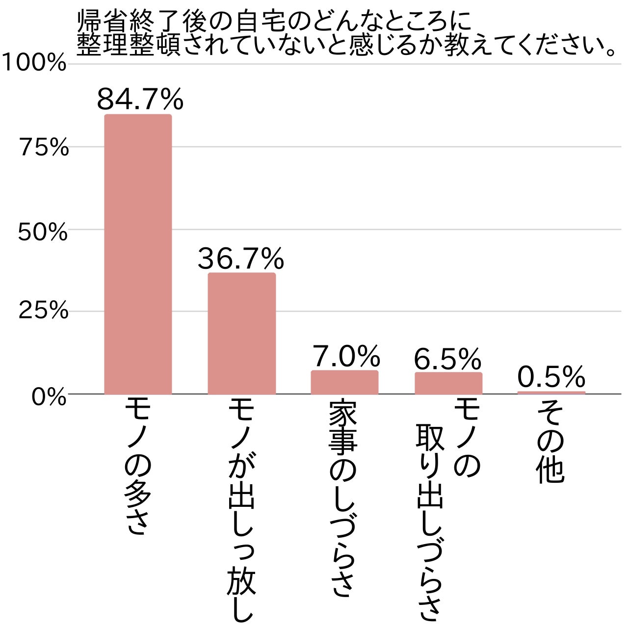手伝いや、普段と違う環境で気を遣うなど、帰省終了後に疲れを感じる方は約7割、帰省終了後の家事が大変だと感じる方も約7割でした。食事の用意をはじめ、帰省時にたまった洗濯・掃除も負担になっています。帰省終了後自宅が整理整頓されていないと感じる方は約半数で、背景には収納スペース不足の問題がありました。