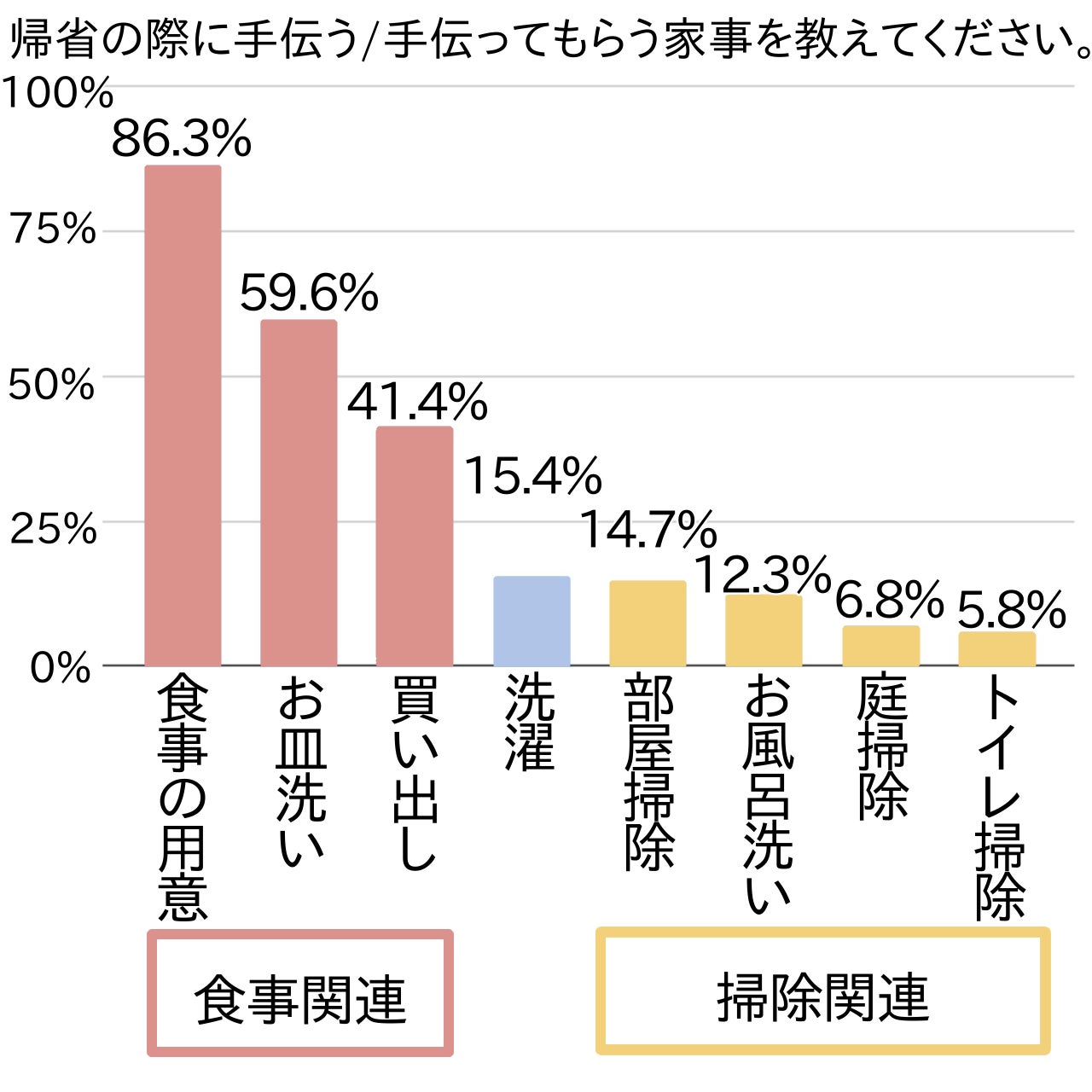 帰省時の家事手伝いは食事関連が中心で洗濯・掃除をする方は少ない傾向があるようです。