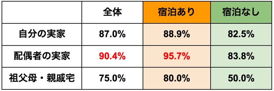配偶者の実家に帰省する場合の手伝い率が高く、宿泊ありでは95.7%にのぼり、ほとんどの方が手伝いをしていることがわかりました。