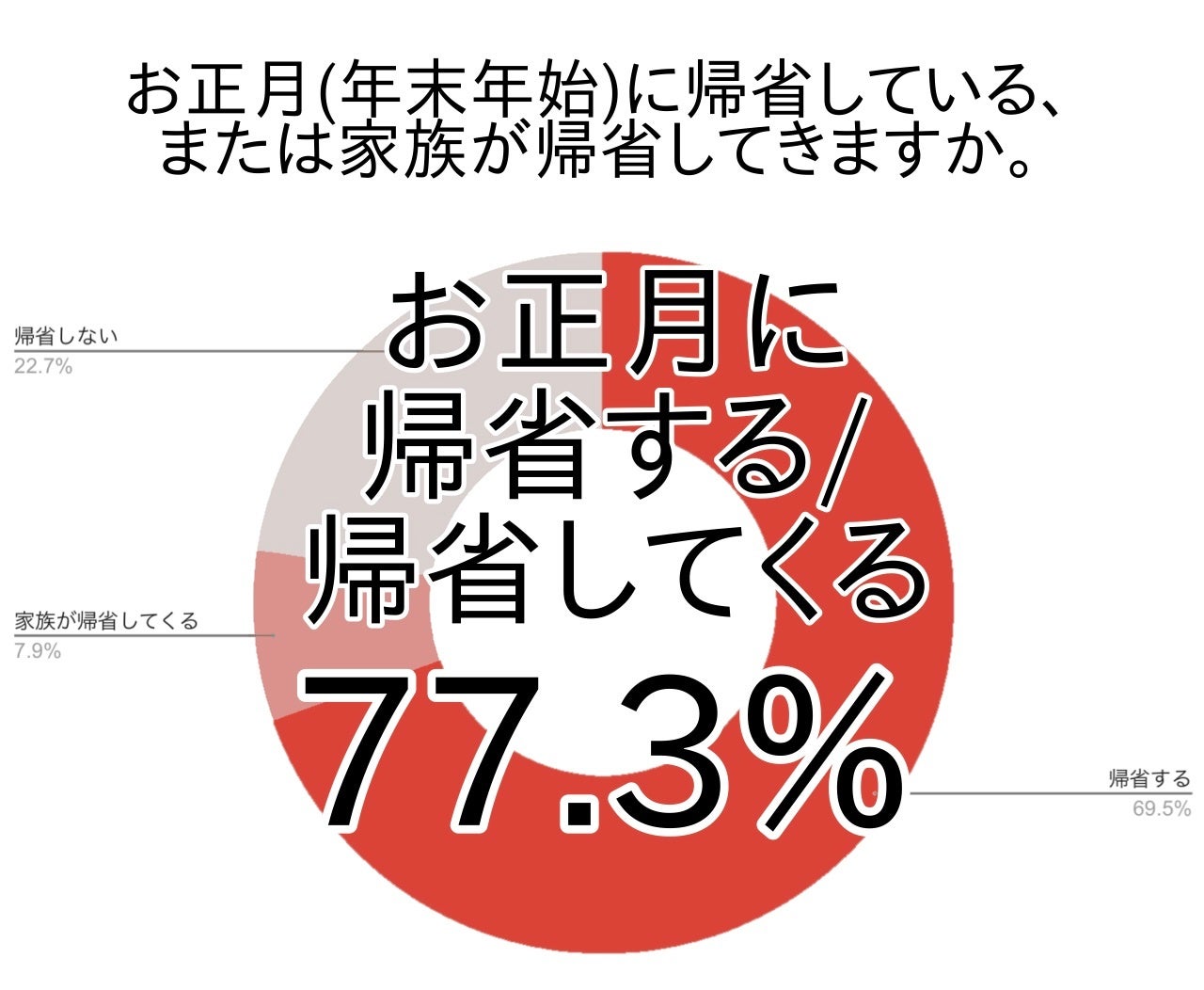 今回のアンケートでは、お正月(年末年始)に帰省している・家族が帰省してくると答えた方は7割台(全国77.3%・関東74.2%)でした。